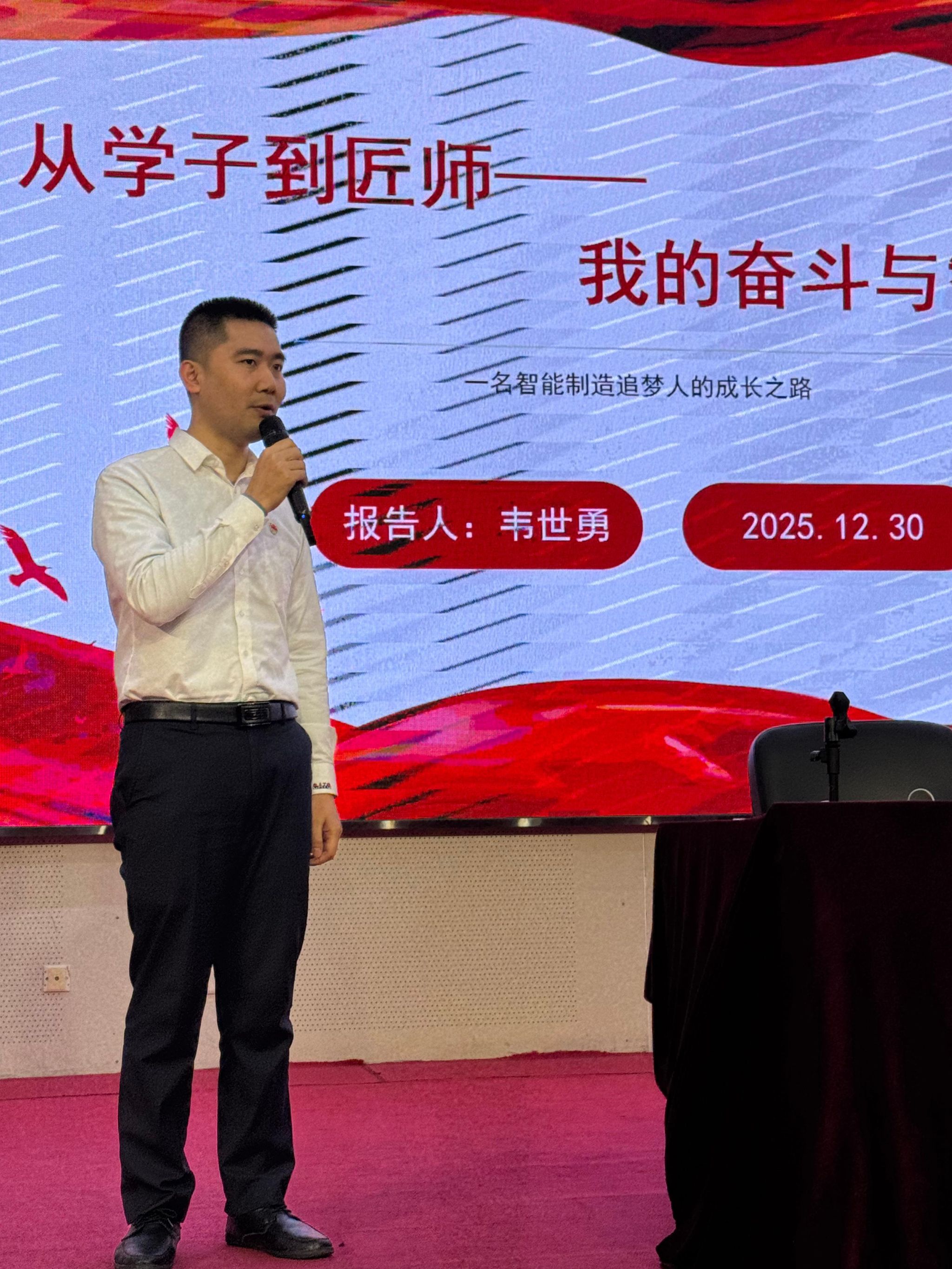为深入学习贯彻党的二十大精神,大力弘扬劳模精神、劳动精神、工匠精神,激励青年学子走技能成才和技能报国之路,2025年12月30日晚,我院特邀巨冈精工(广东)股份有限公司研发经理、高级工程师、特级技师、国务院政府特殊津贴获得者韦世勇劳模走进校园,在松山湖校区图书馆学术报告厅,为我院师生带来了一场主题为《从学子到匠师——我的奋斗与智造梦想》的精彩报告。