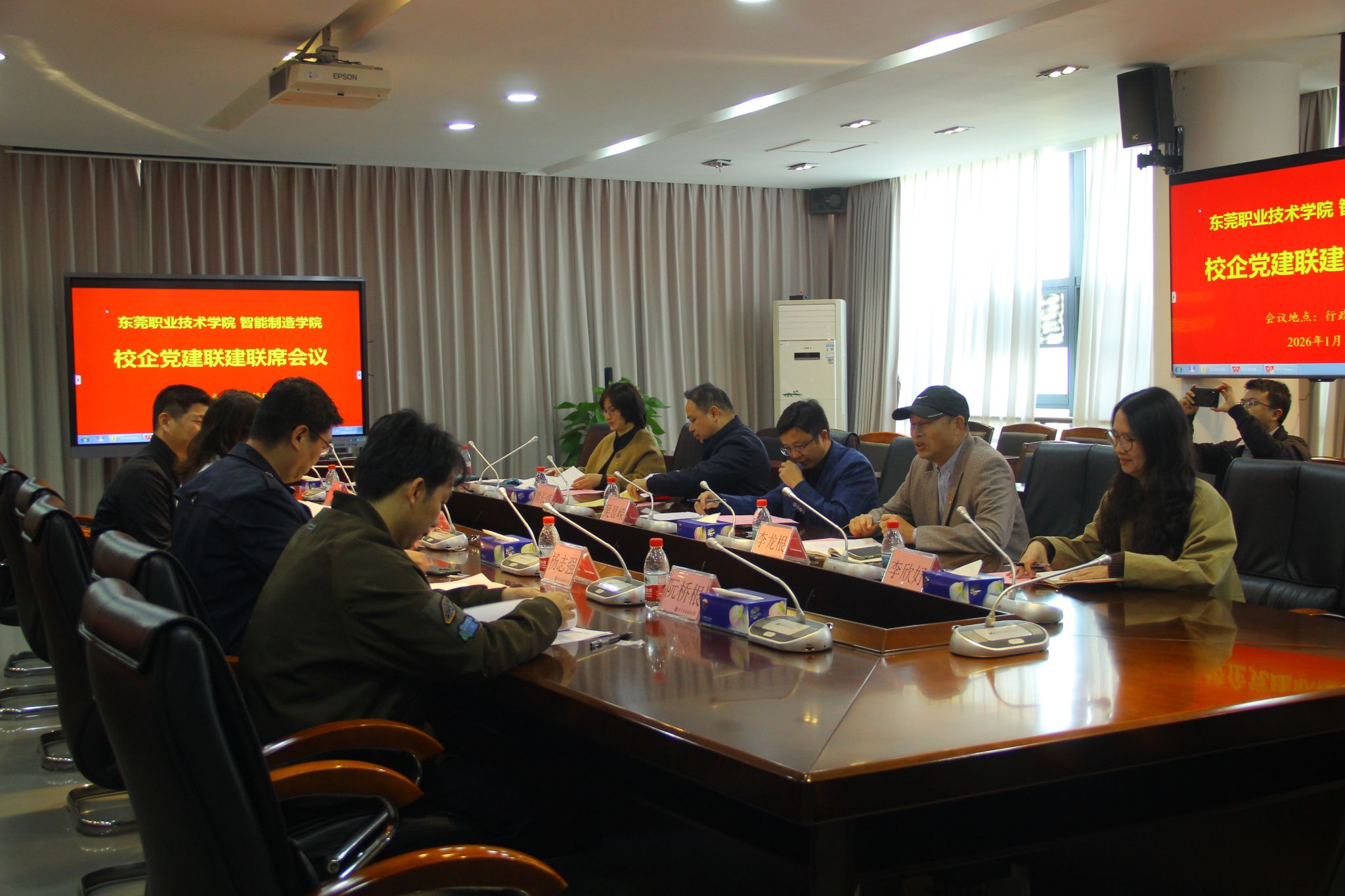 为深入贯彻落实党和国家关于职业教育高质量发展的重要部署,进一步推动“组织共建、机制共融、资源共享、发展共谋、成果共赢”的校企党建联建模式走深走实,我校智能制造学院党总支牵头,于2026年1月13日上午在立德楼B415顺利召开东莞职业技术学院智能制造学院校企党建联建会议。我校党委组织部部长吴显嵘、智能制造学院党总支书记李龙根、东莞市机电工程学校党总支书记张俊容、东莞市电子商贸学校党总支书记李茂才、东莞新能德科技有限公司党支部书记杨志强、广东日信高精密科技有限公司代表卢王来等出席会议。中高企三方共商党建联建发展新模式,共谋产教融合提质增效新路径。